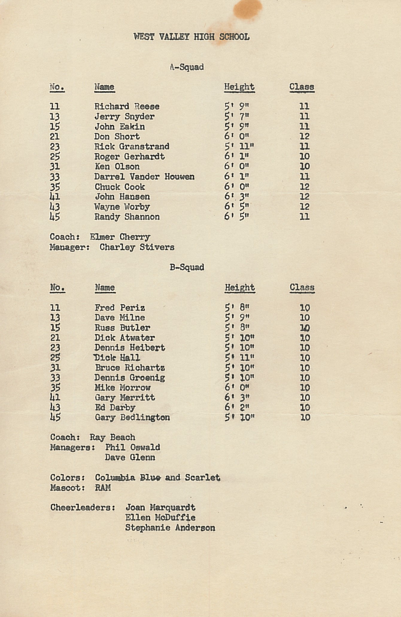 1963.1220 Page 3 Toppenish High School Basketball Program 63-64 vs West Valley High School West Valley Head Coach and Bench personel