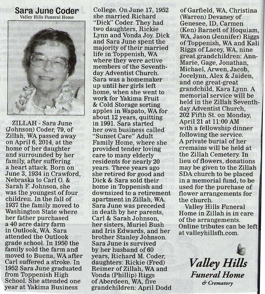 Sara June Johnson Coder obituary